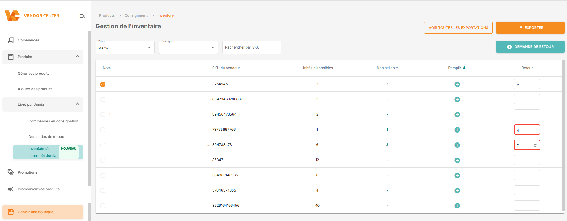 1. From the Products menu choose the new sub-menu item “FBJ Inventory” Choose or search the products to return, then choose “Return Request”